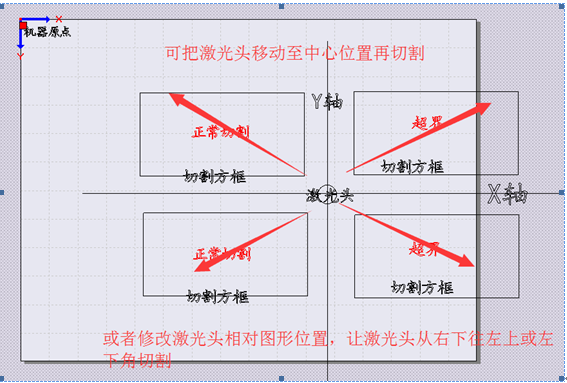 此时可把激光头相对图形位置的方向设置为右上或者右下角,往左上或者左下切割;也可以把激光头向左移动至足够切割位置。